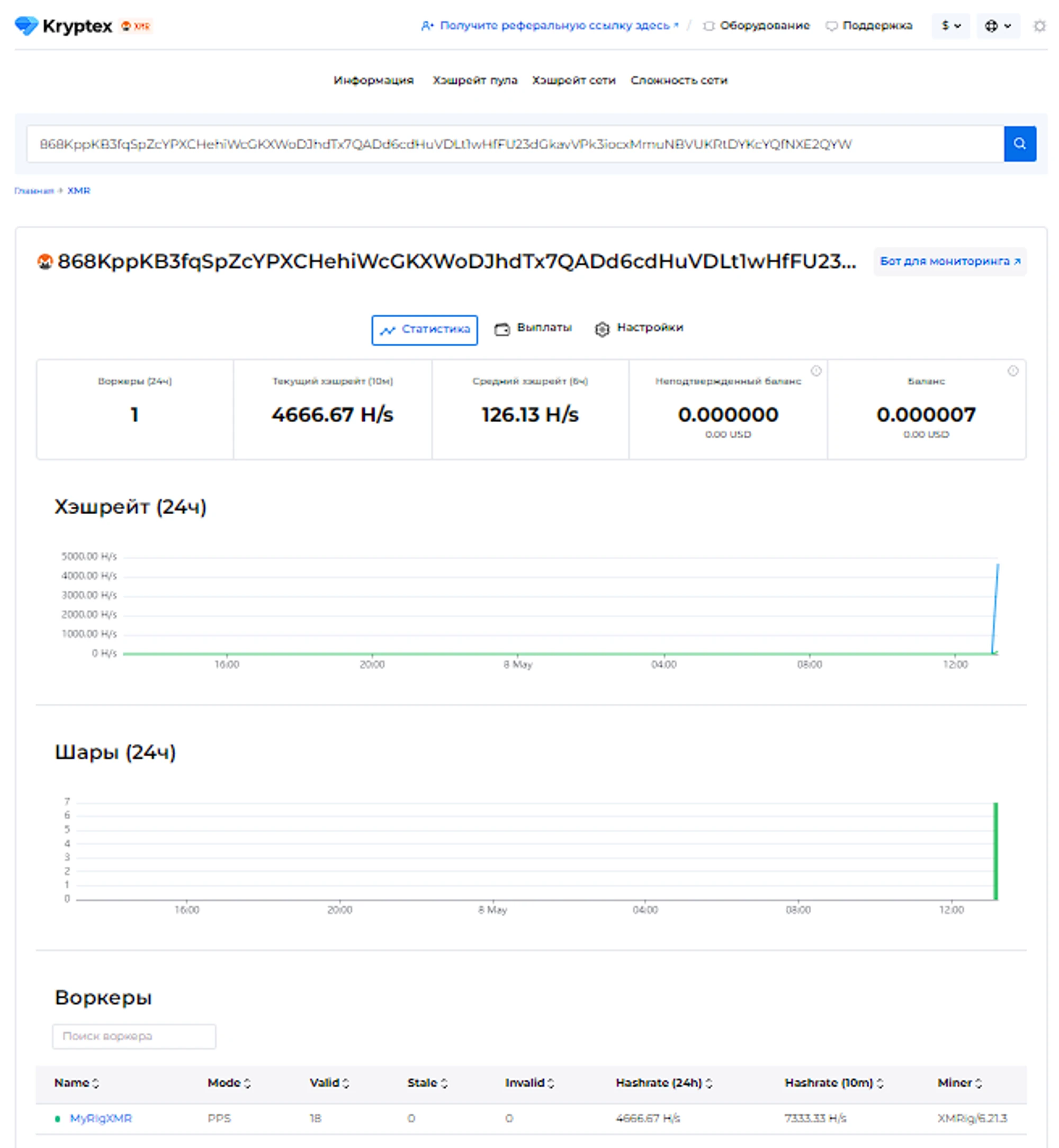 Перед вами откроется страница со статистикой вашего кошелька и ваших рабочих ферм. Статистика появляется через 10-15 минут после запуска майнинга.