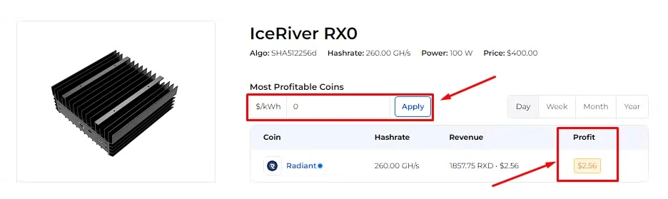 Currently, the daily profitability of IceRiver RX0 is about ~ 2,56$, excluding electricity costs.
