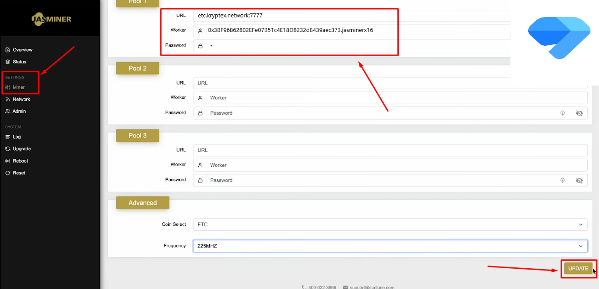 Нажмите “Update”, чтобы сохранить настройки и запустить майнинг.