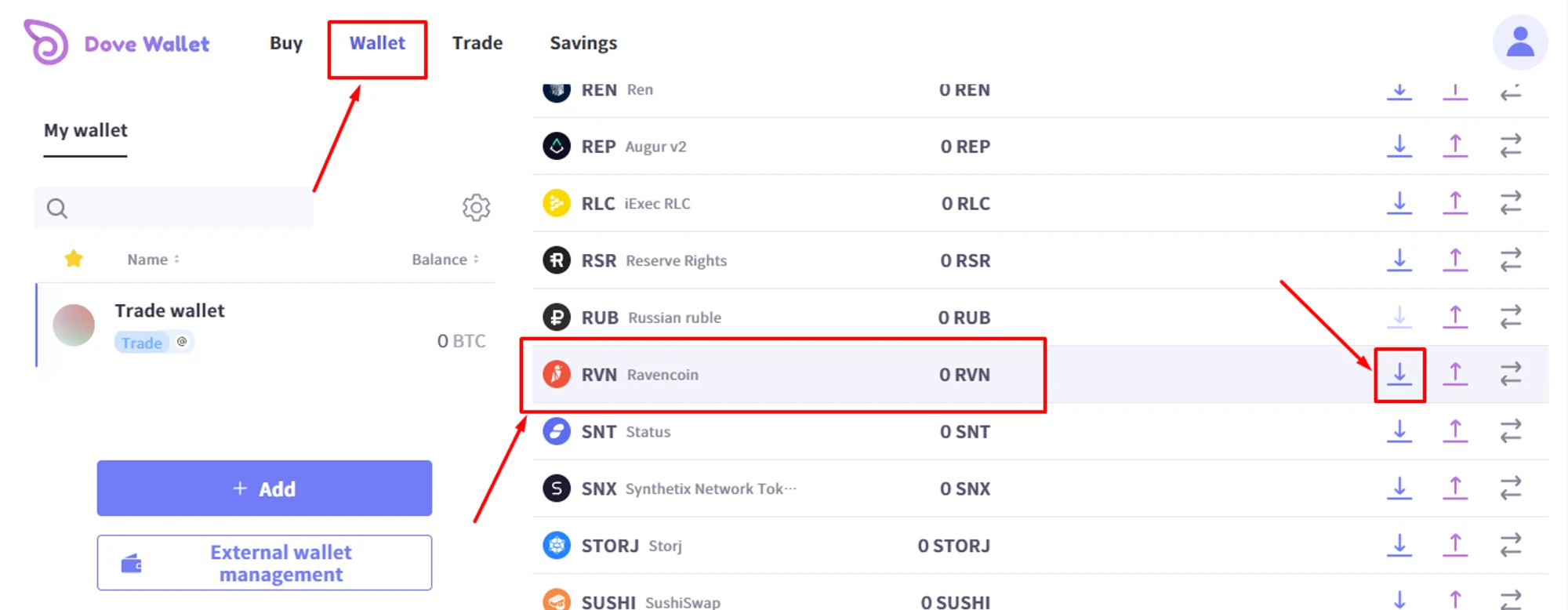 Go to the "Wallet" tab → Find "RVN" → Click on the "Deposit" icon;