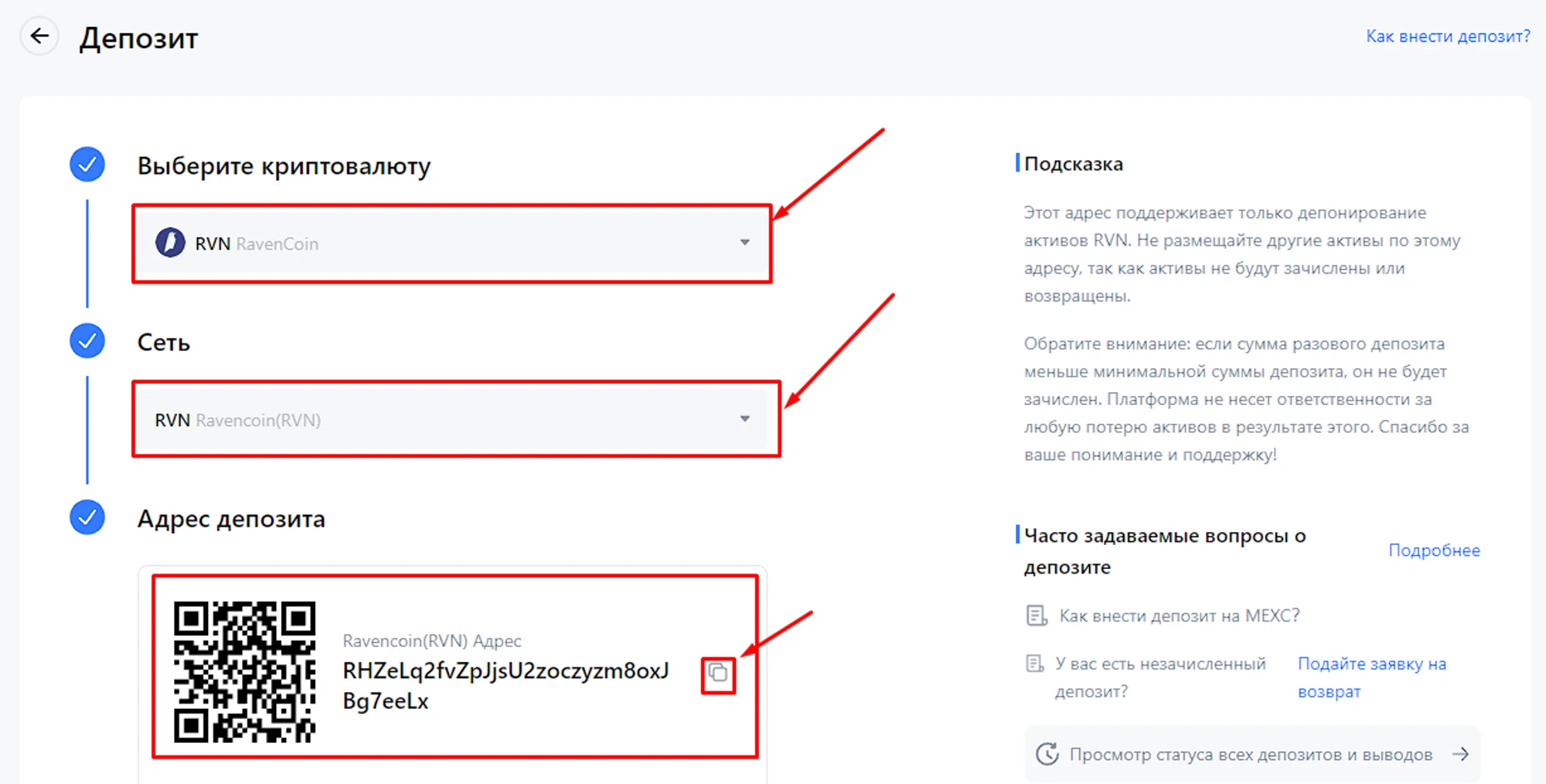 Select "Select Crypto → RVN", "Network → RVN", get "Deposit Address";