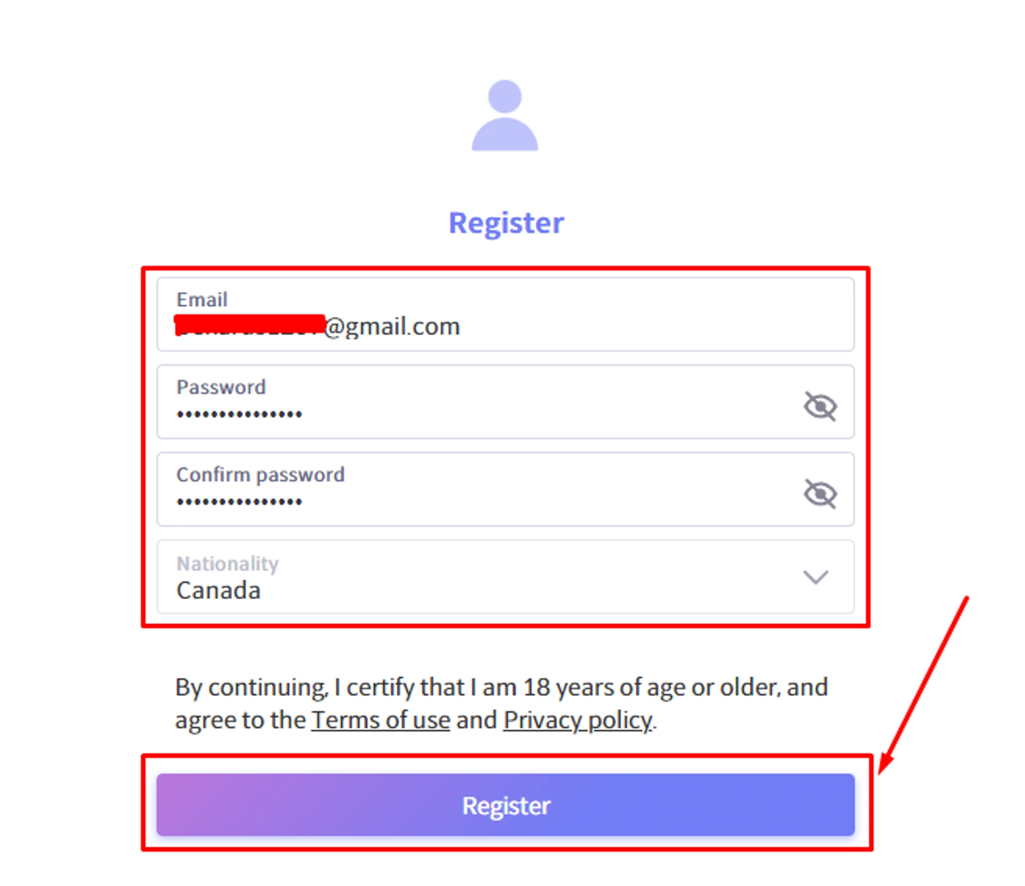 Specify "Email" → specify password → confirm password → accept user agreement → click "Register”;