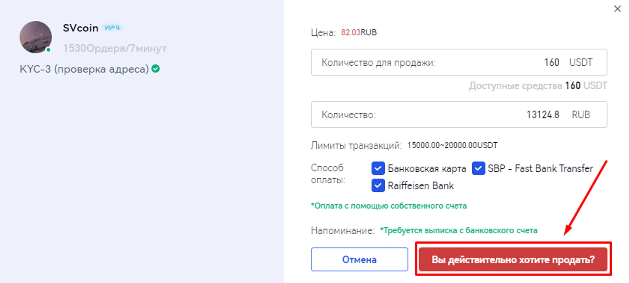 Укажите сумму в USDT для обмена → Выберите способ оплаты (куда хотите получить выплату в фиате) → Подтвердите продажу.