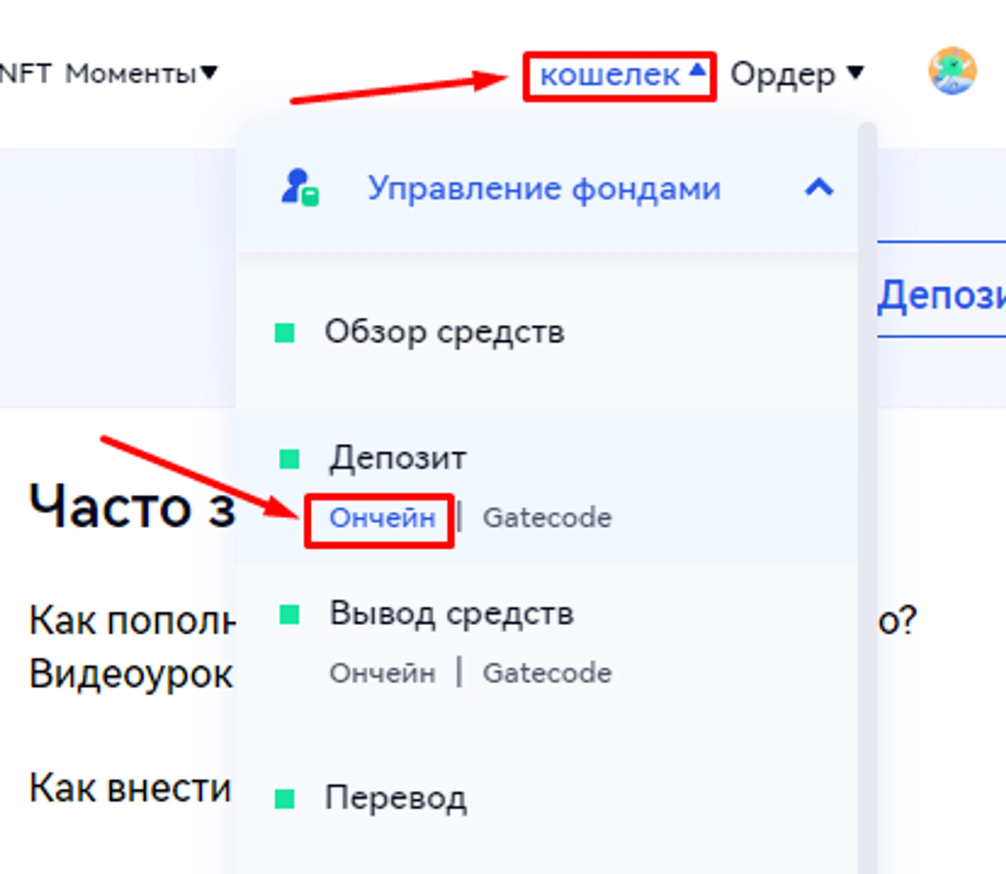 Перейдите в раздел “Кошелёк” → “Депозит” → “Ончейн”. (На других биржах вам может потребоваться перейти в “Спот” кошелёк, и уже потом совершать депозит).