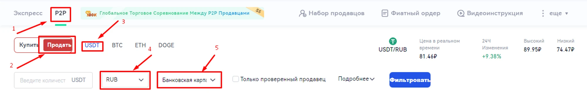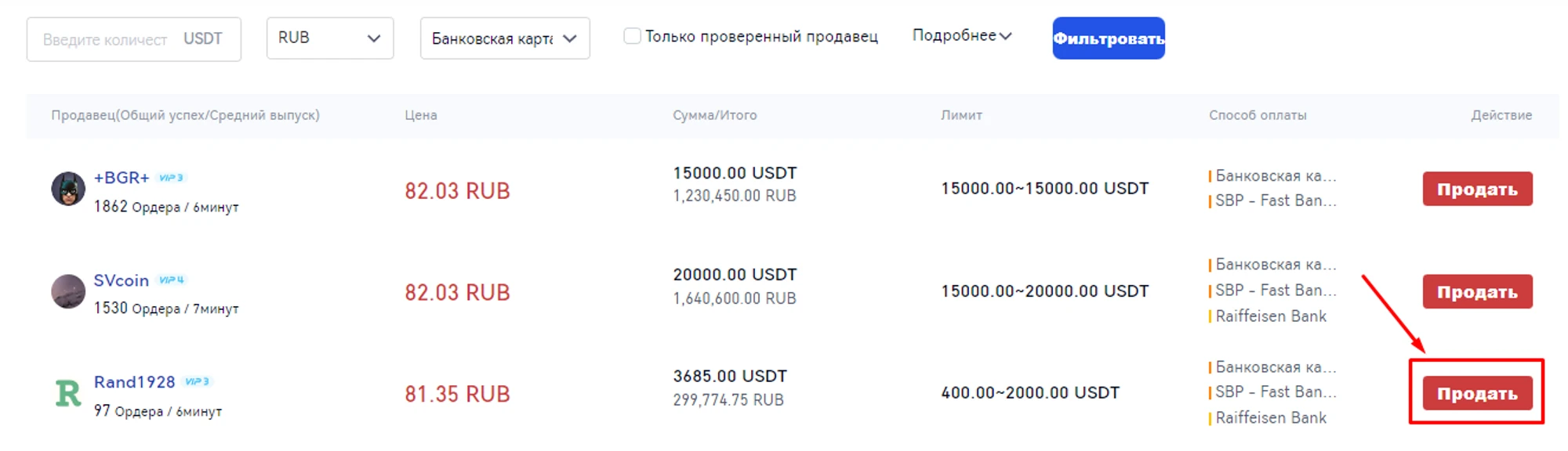 Нажмите “Продать” для продажи монеты (USDT) в фиат;