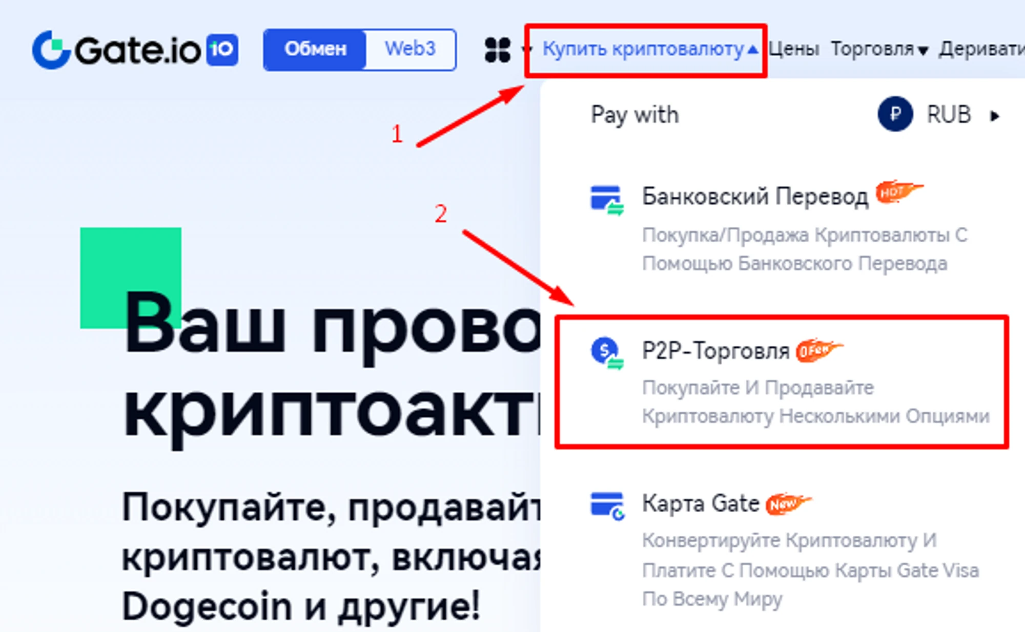 Рассмотрим P2P-обмен на примере биржи Gate.io:
