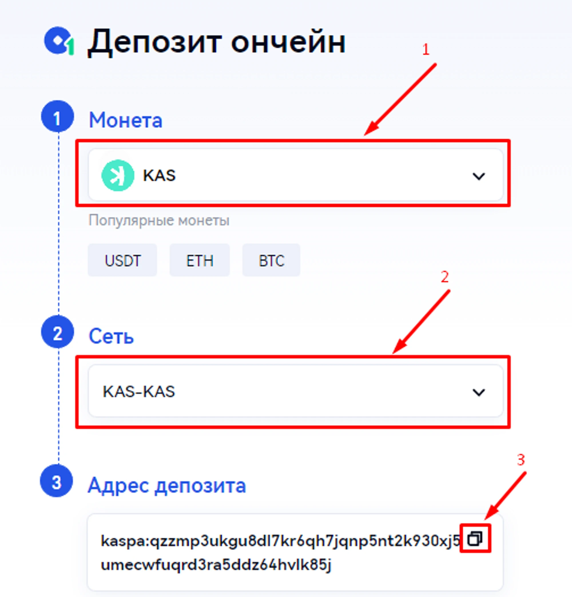 Выберите монету, которую вы хотите перевести на биржу, а так же блокчейн (сеть) для перевода монеты. Например, мы хотим перевести KASPA;
