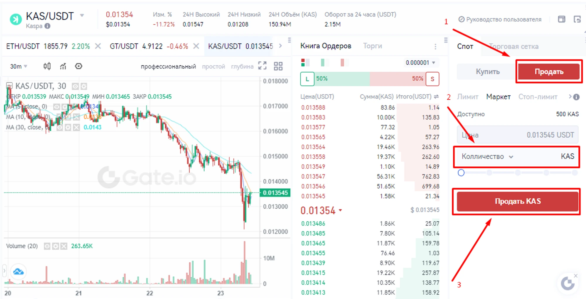 Нажмите кнопку “Продать KAS” чтобы завершить сделку.