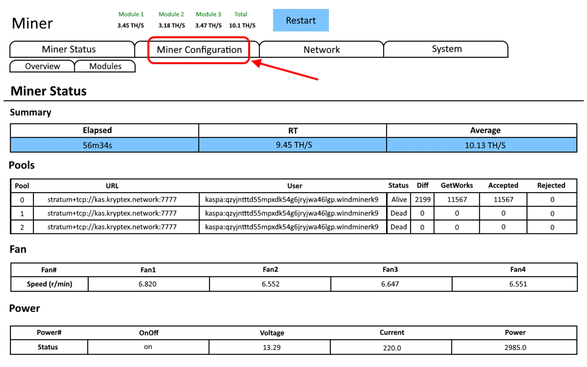 Нажмите “Save”, чтобы сохранить настройки, а затем нажать “Restart” для перезагрузки АСИКа.