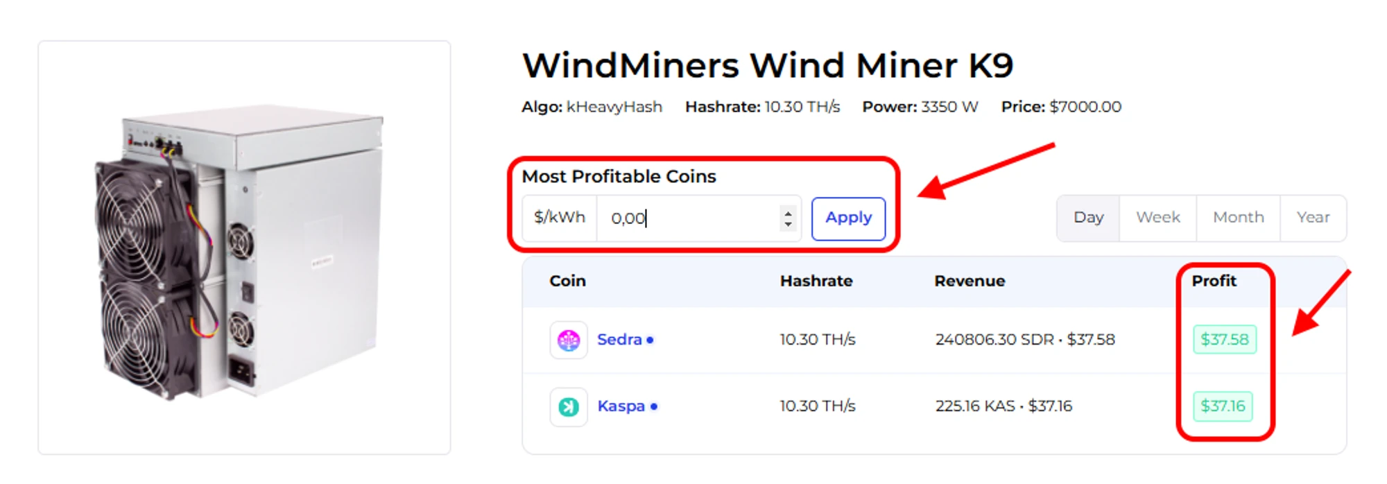 Посчитать доходность АСИКа Wind Miner K9 на калькуляторе майнинга.