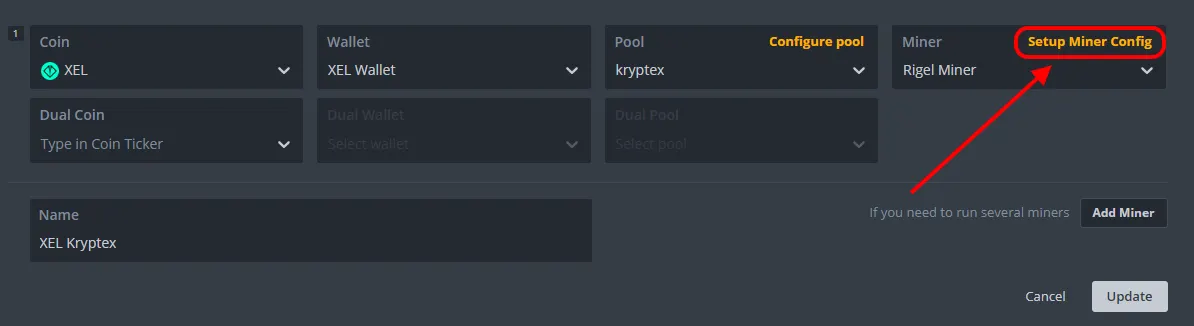 Choose “Rigel Miner” and click on “Setup Miner Config” next to the chosen miner.
