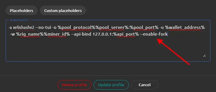 Go to the “Advanced” tab, add the --enable-fork argument and click “Update profile” so that the miner will automatically switch to the new algorithm after the hard fork.