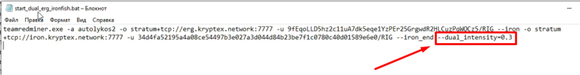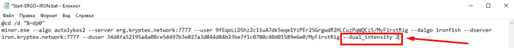 --dual_intensityс нужным значением;Сохраните изменения → Нажмите “Save” в поле для аргументов → Нажмите “Save” для сохранения настроек майнера.