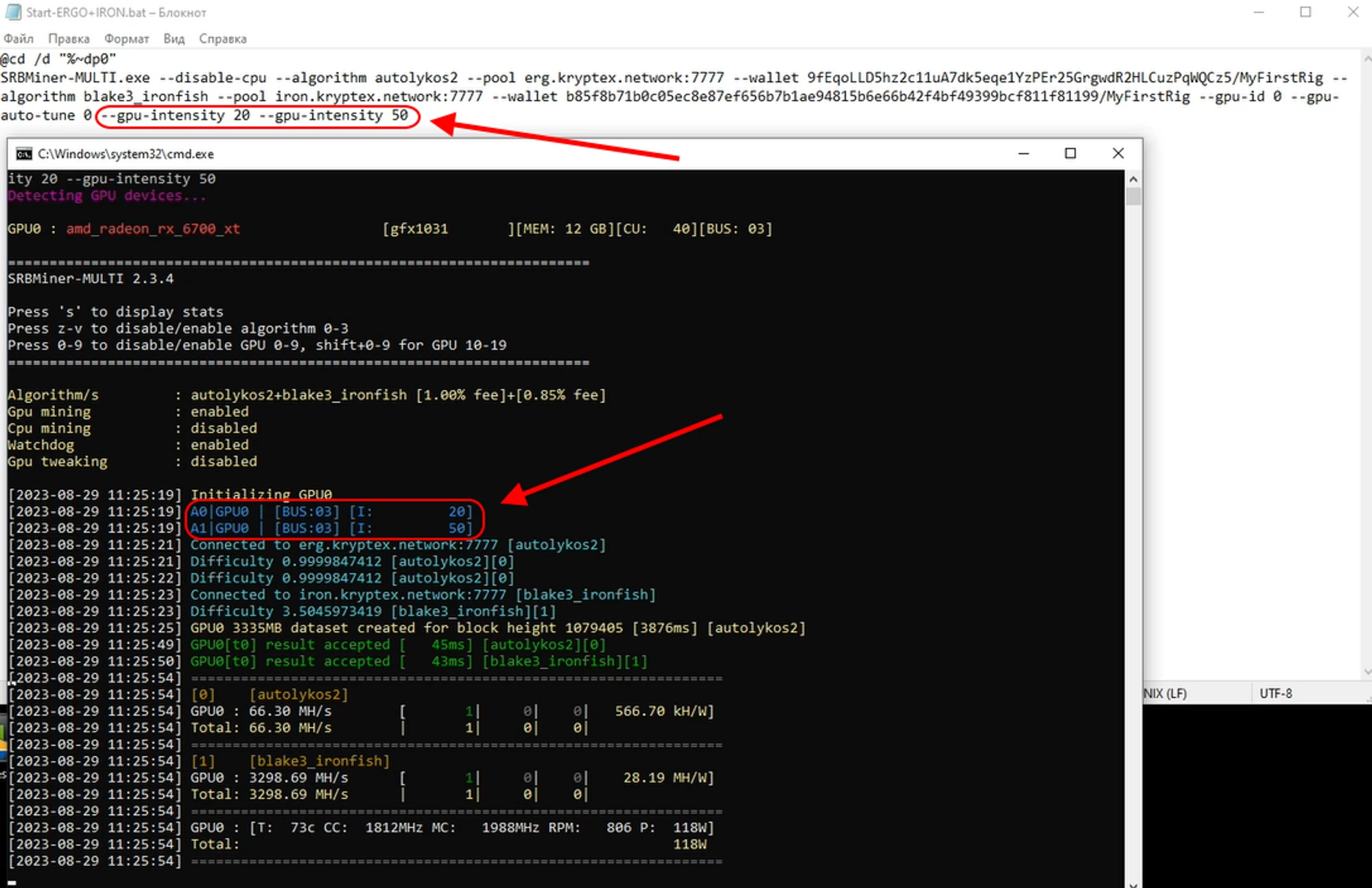 Первый аргумент --gpu-intessity 20 — отвечает за интенсивность майнинга первого алгоритма A0 (если вы майните ERGO+IRON, то первый алгоритм A0 это ERGO). Значение 20 выбрали как пример. Установите ваше значение в диапазоне от 1 (самая слабая интенсивность) до 31 (самая высокая интенсивность). Если установить значение 0 — майнер будет подбирать значение самостоятельно.