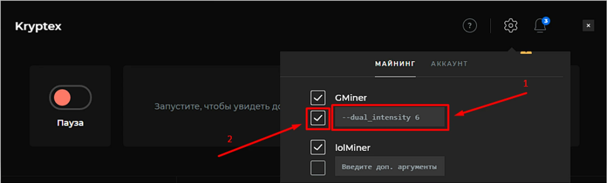 --dual_intensityс нужным значением в поле для аргументов;Поставьте галочку рядом с полем аргументов майнера для применения настроек.