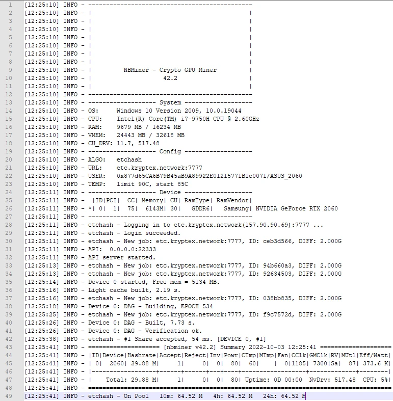 Все параметры запуска, все события во время майнинга, все возможные ошибки записываются в лог, чтобы в дальнейшем можно было проанализировать работу майнера.
