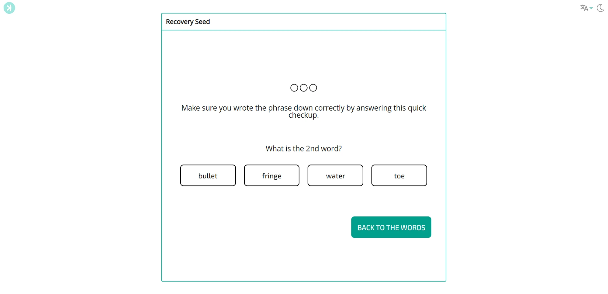 Гаманець перевірить, наскільки добре ви запам'ятали вашу секретну фразу та порядок слів. Вас попросять тричі вибрати правильне слово до вказаного порядку. Щоразу порядок буде різний, на вибір буде дано кілька кодових фраз. Вибирайте ту, яка стосується конкретного номеру слова. Якщо забули, чи не записали — гаманець запропонує повернутися до порядку слів і повторить процедуру перевірки.