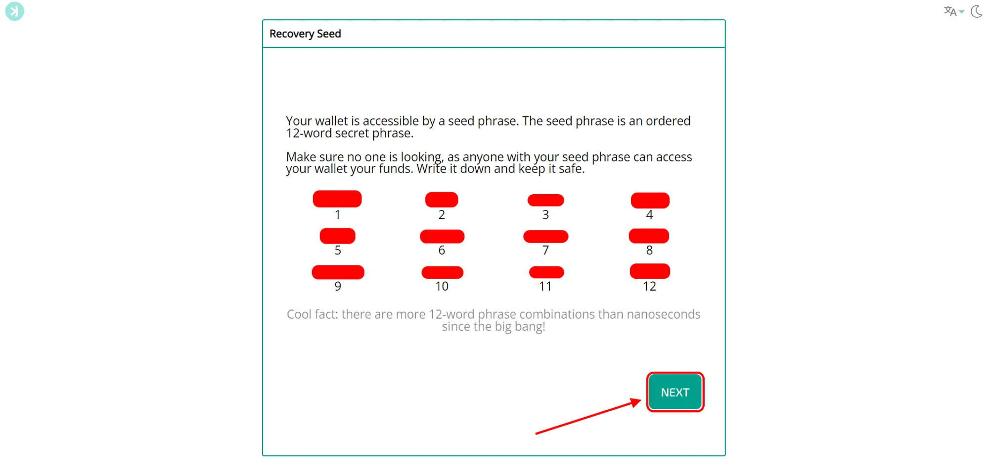 Ви отримаєте секретну фразу — комбінацію з 12 слів. Їхня втрата означає втрату доступу до гаманця! Випишіть та збережіть комбінацію слів у тому порядку, як вона буде представлена перед вами. Після цього натисніть "Next" — Далі.