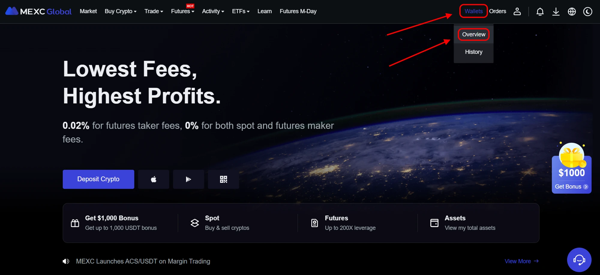 Після реєстрації виберіть Wallets (Гаманці) та Overview (Огляд).