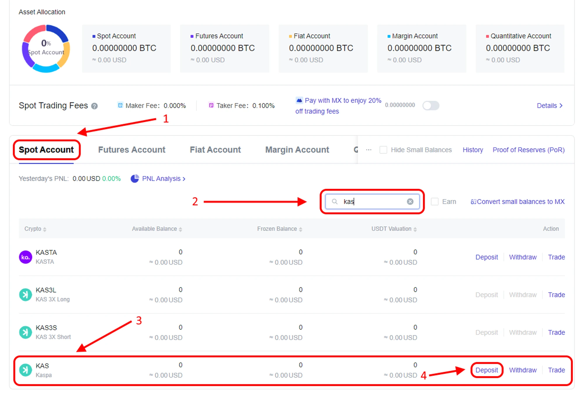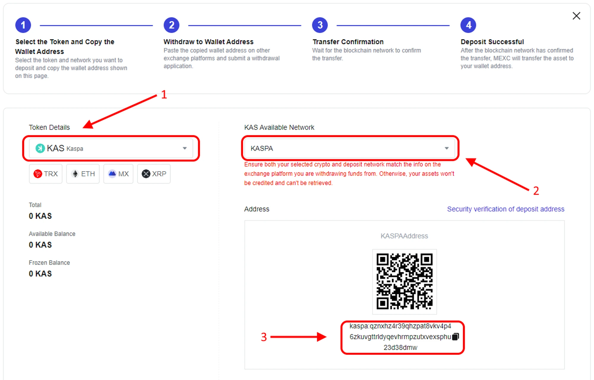 kas, виберіть у списку монетуKAS (Kaspa), та натисніть Deposit (Поповнити).