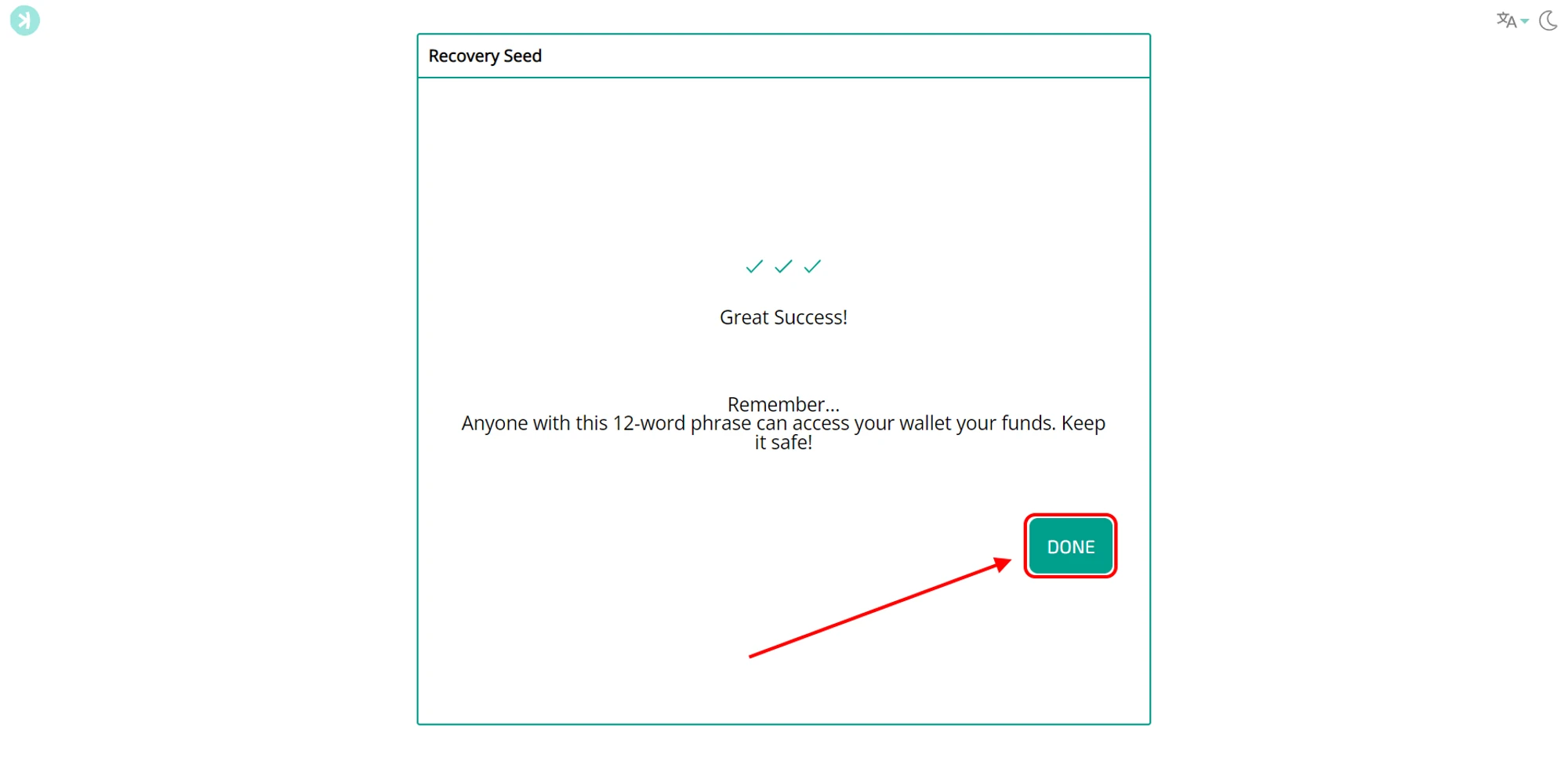 Після успішної перевірки гаманець нагадає вам правила безпеки. Той, хто володіє секретною фразою з 12 слів — володіє гаманцем! Підтверджуємо, що ми це запам'ятали і переходимо до самого гаманця. Натискаємо кнопку "Done" — Готово.