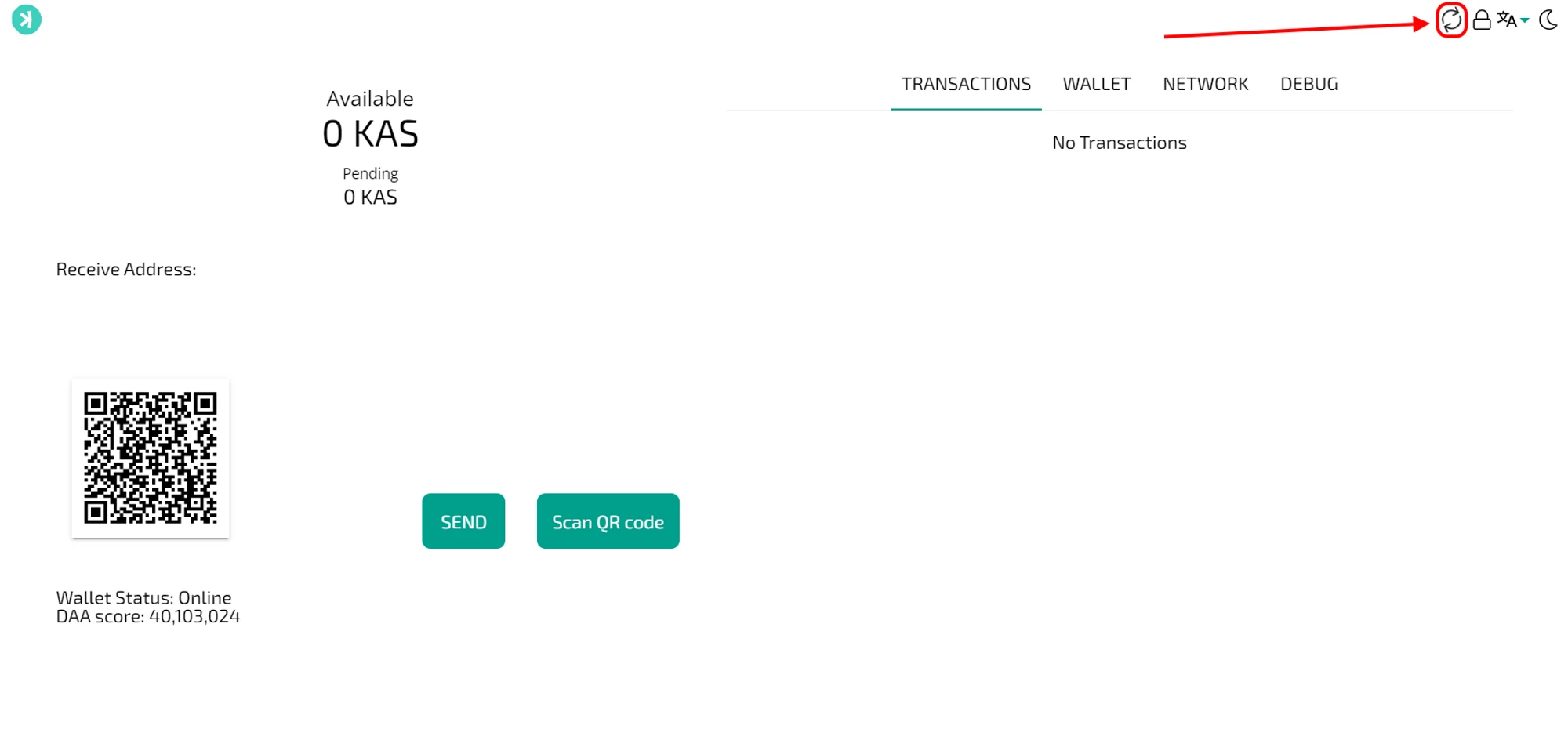 Коли синхронізація закінчиться, ви побачите адресу вашого гаманця. Готово! Ваш гаманець готовий до роботи. Натисніть значок поряд з адресою гаманця, щоб скопіювати її. Використовуйте її для майнінгу або отримання Каспи на ваш рахунок.
