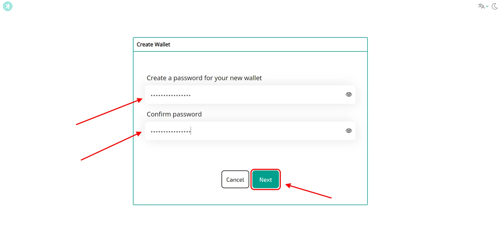Гаманець просить ввести пароль для вашого гаманця та підтвердити його. Згенеруйте надійний пароль вашим браузером, або скористайтеся генератором паролів. Введіть пароль, підтвердіть його, та натисніть "Next" — Далі.