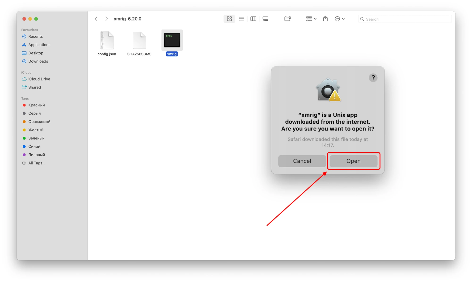 xmrigminer by double-clicking on it and grant permission for the downloaded file to run.