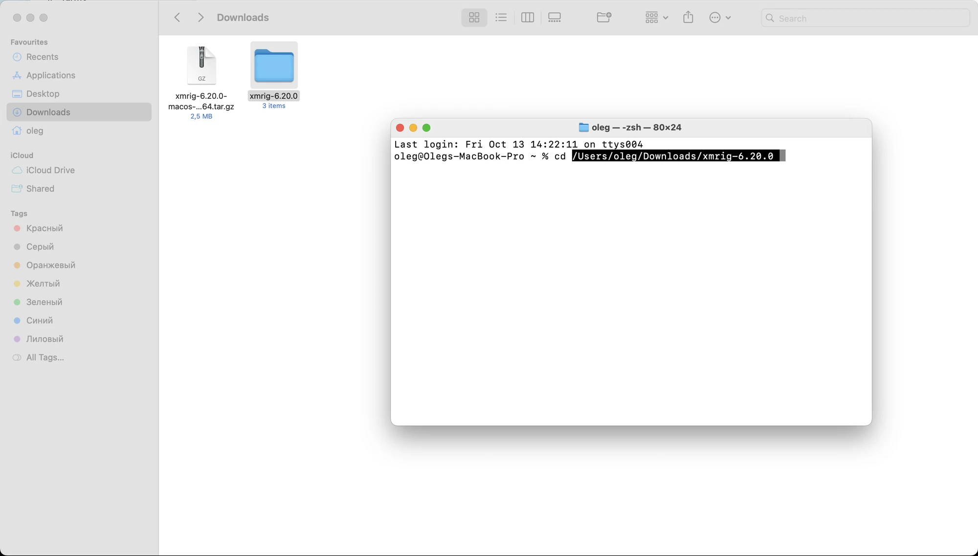 cdcommand in the terminal, then drag the folder with the miner into the terminal window using your mouse cursor. After that, press Enter.