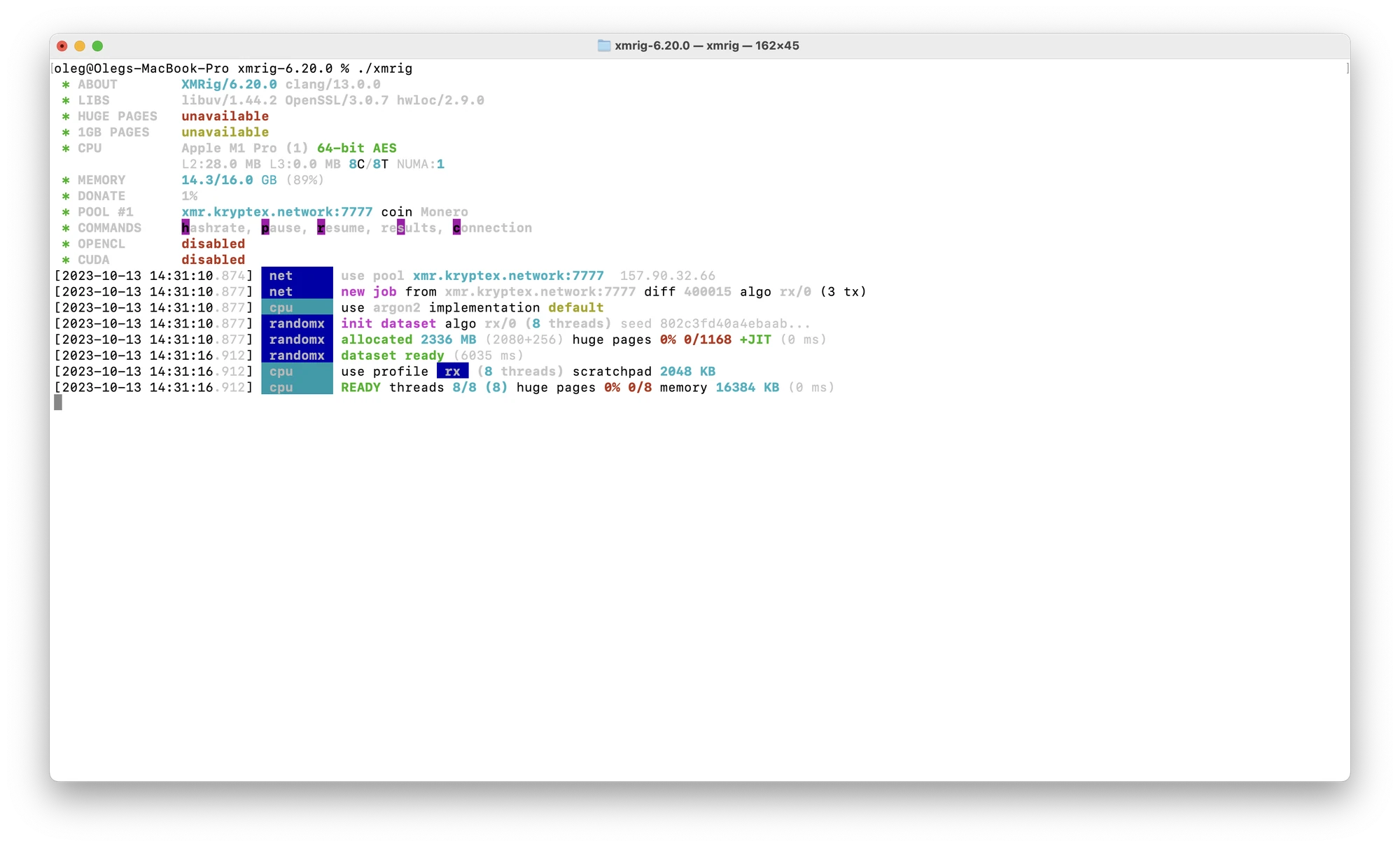 Example:./xmrig -o xmr.kryptex.network:7029 -u 48edfHu7V9Z84YzzMa6fUueoELZ9ZRXq9VetWzYGzKt52XU5xvqgzYnDK9URnRoJMk1j8nLwEVsaSWJ4fhdUyZijBGUicoD/MyFirstRig -k --coin monero -a rx/0The mining launches based on the settings you specified in the terminal command. To stop mining, just close the terminal window.