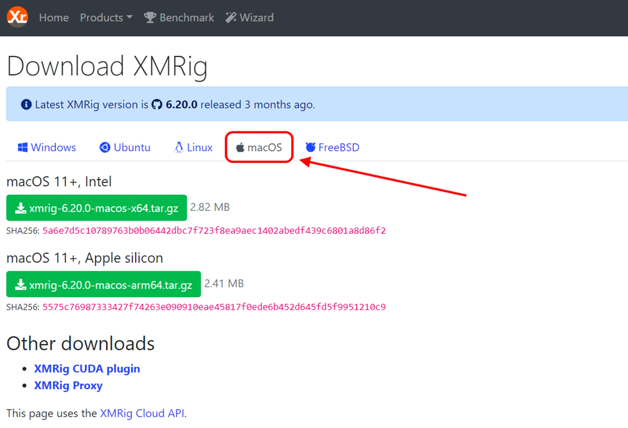 Visit the XMRig miner developer website, and download the MacOS miner tailored for your specific processor. Apple computers come with either an Intel processor or an Apple processor. Download the appropriate miner based on the processor installed in your computer. Let's consider the example of the Apple processor.