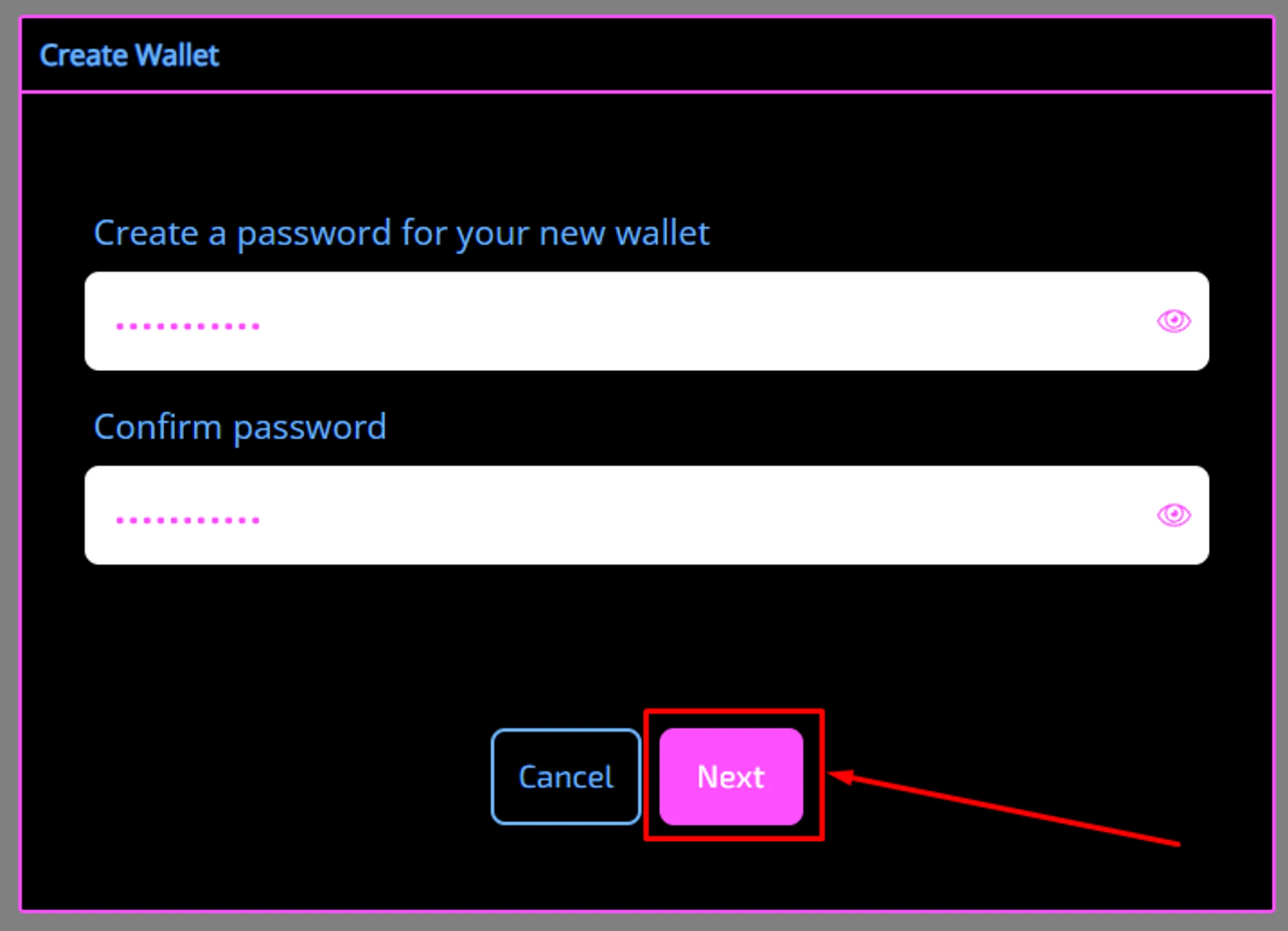 Кошелёк просит ввести пароль для вашего кошелька и подтвердить его. Сгенерируйте надёжный пароль вашим браузером, или воспользуйтесь генератором паролей. Введите пароль, подтвердите его, и нажмите “Next” — создать кошелёк.
