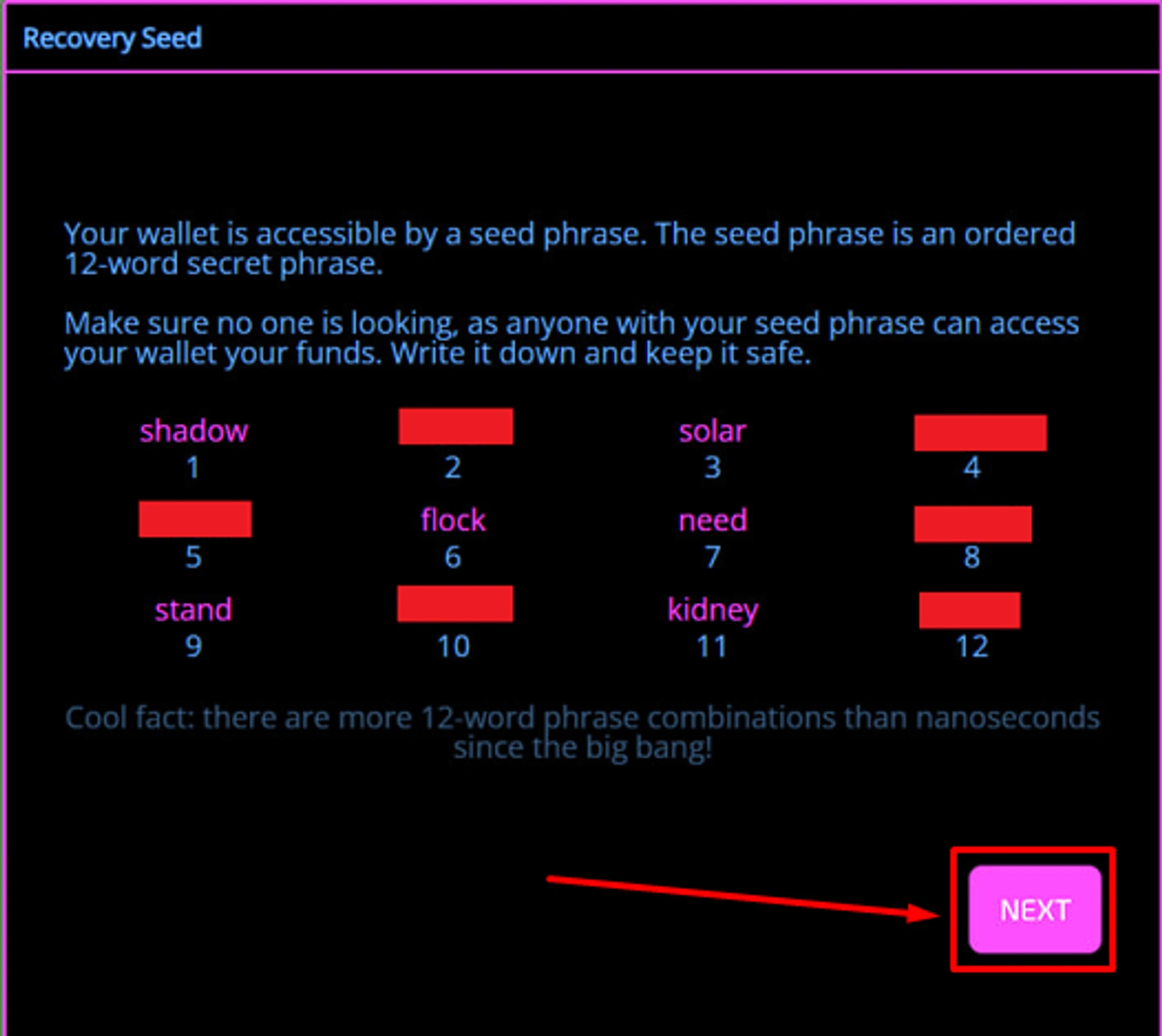 Вы получите секретную фразу — комбинацию 12 слов. Их потеря означает потерю доступа к кошельку! Выпишите и сохраните комбинацию слов в том порядке, как она будет представлена перед вами. После чего нажмите “Next” — Далее.