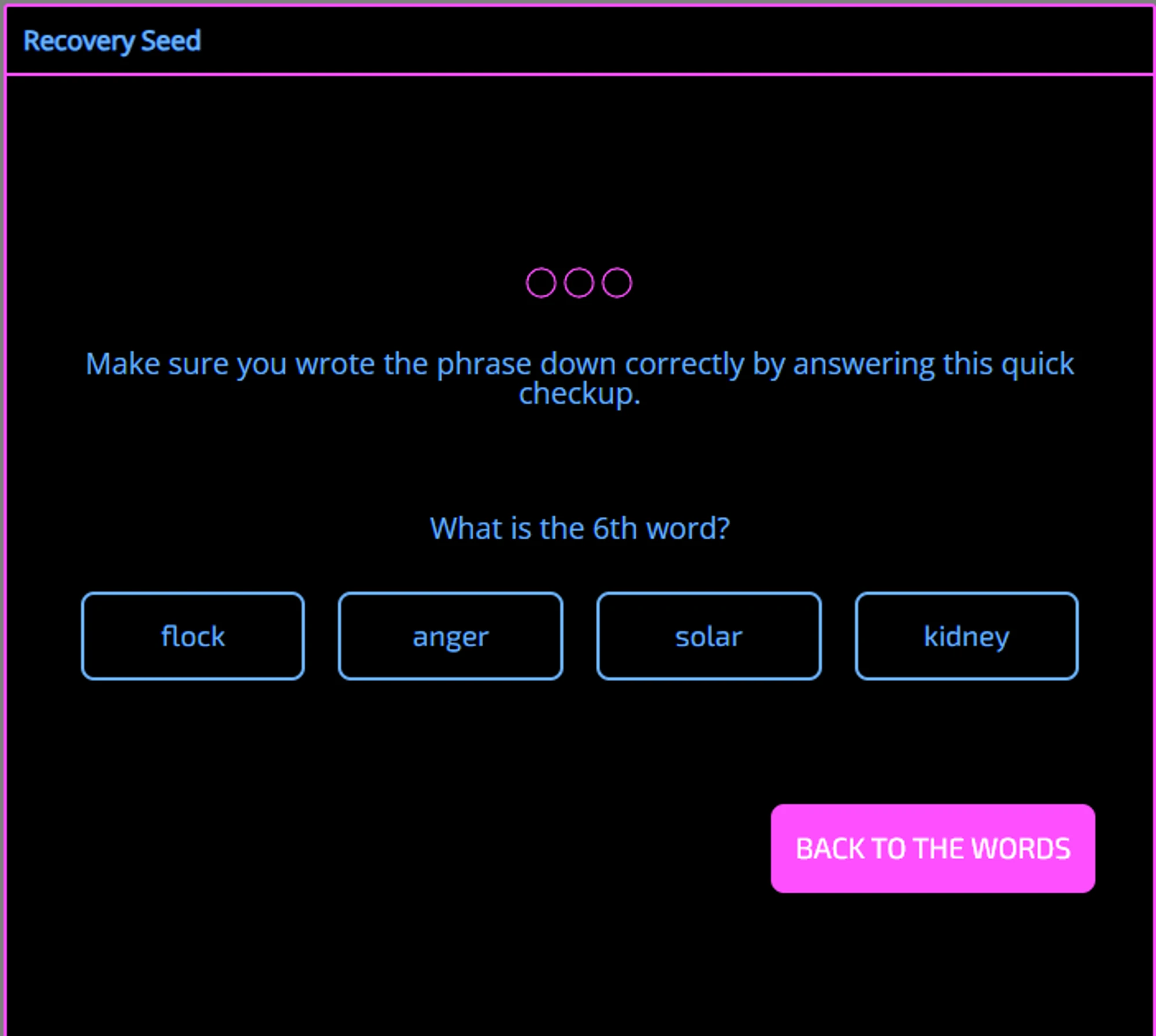 Кошелёк проверит, на сколько хорошо вы запомнили вашу секретную фразу и порядок слов. Вас попросят трижды выбрать правильное слово на указанной позиции. Если забыли, или не записали — кошелёк предложит вернуться к порядку слов, и повторит процедуру проверки.