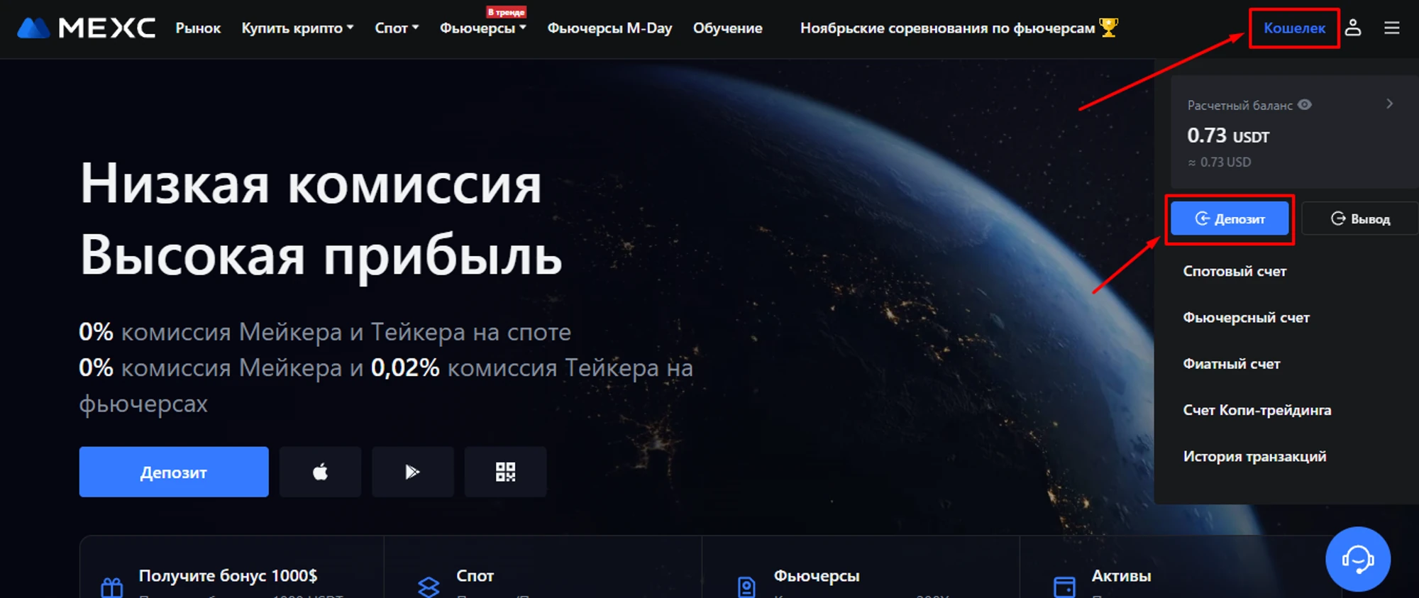 После регистрации, выберите “Кошелёк”, затем “Депозит”;