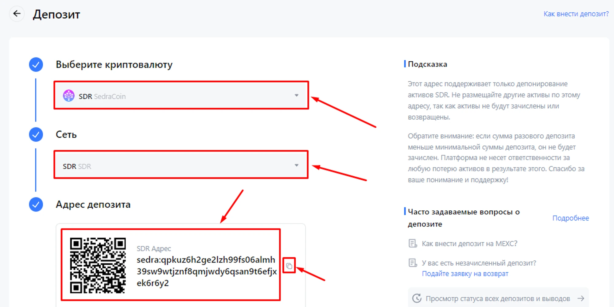 Откроется страница депозитов, выберите “Выберите криптовалюту → SDR”, “Сеть → SDR”, получите “Адрес депозита”;