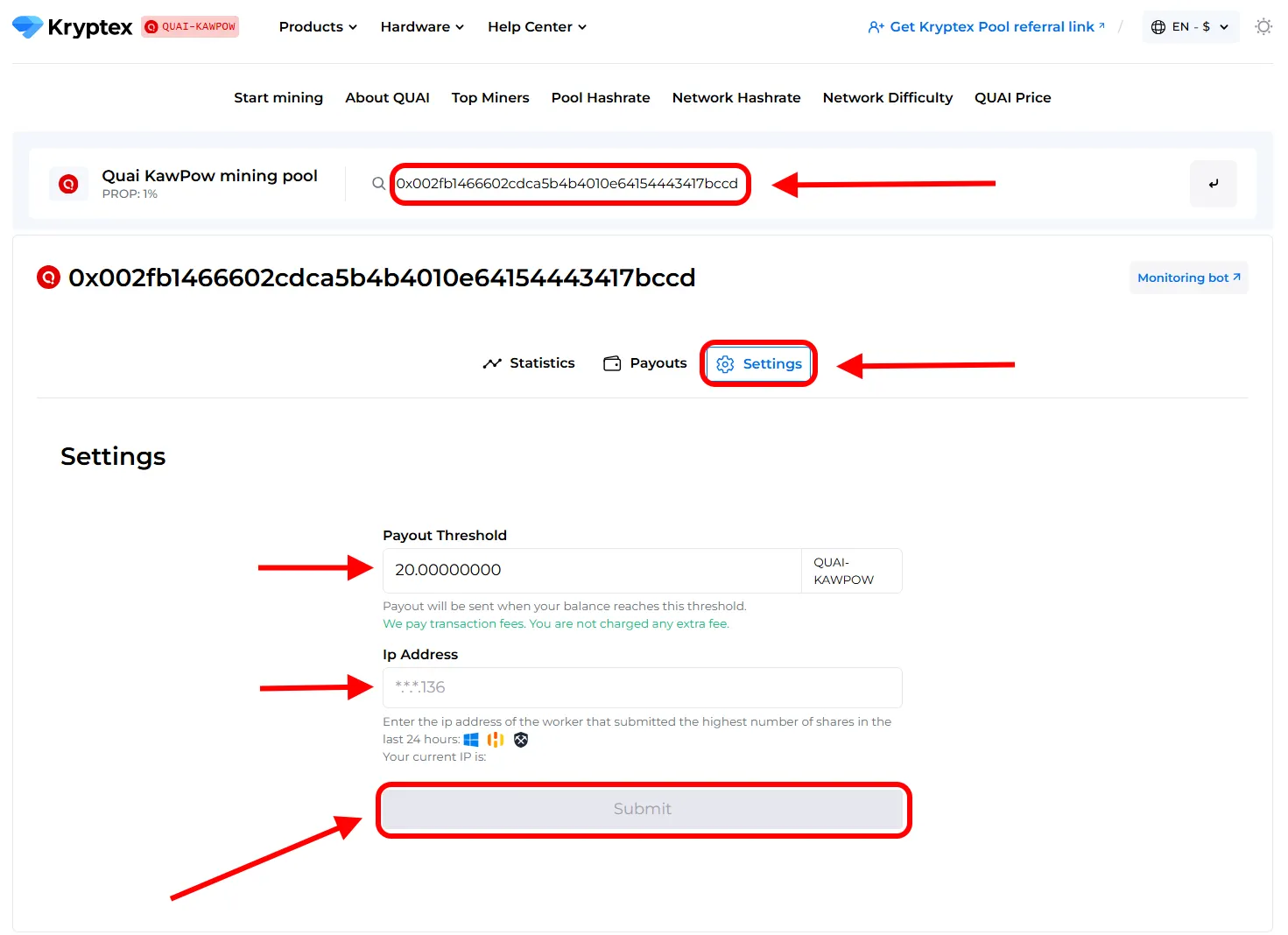 Set the desired “Payment Threshold”. Minimum and maximum payment threshold mentioned at the pool home page. There is no payout fee — Kryptex pays it for you 🖤