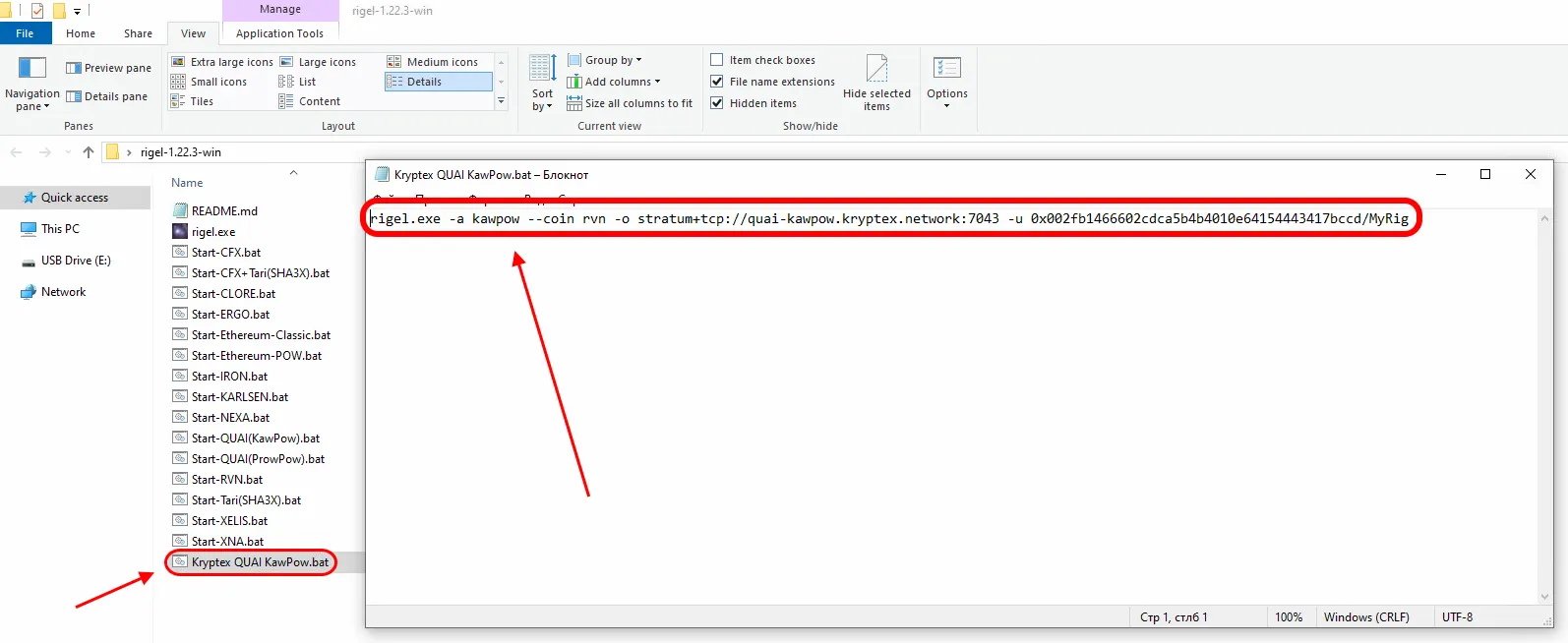 .txtwith the Notepad application. Let's call itKryptex QUAI KawPow. Then, open the file, and paste the copied sample BAT file into the document. Or you can download a ready-made .bat file from the pool’s page and skip this step